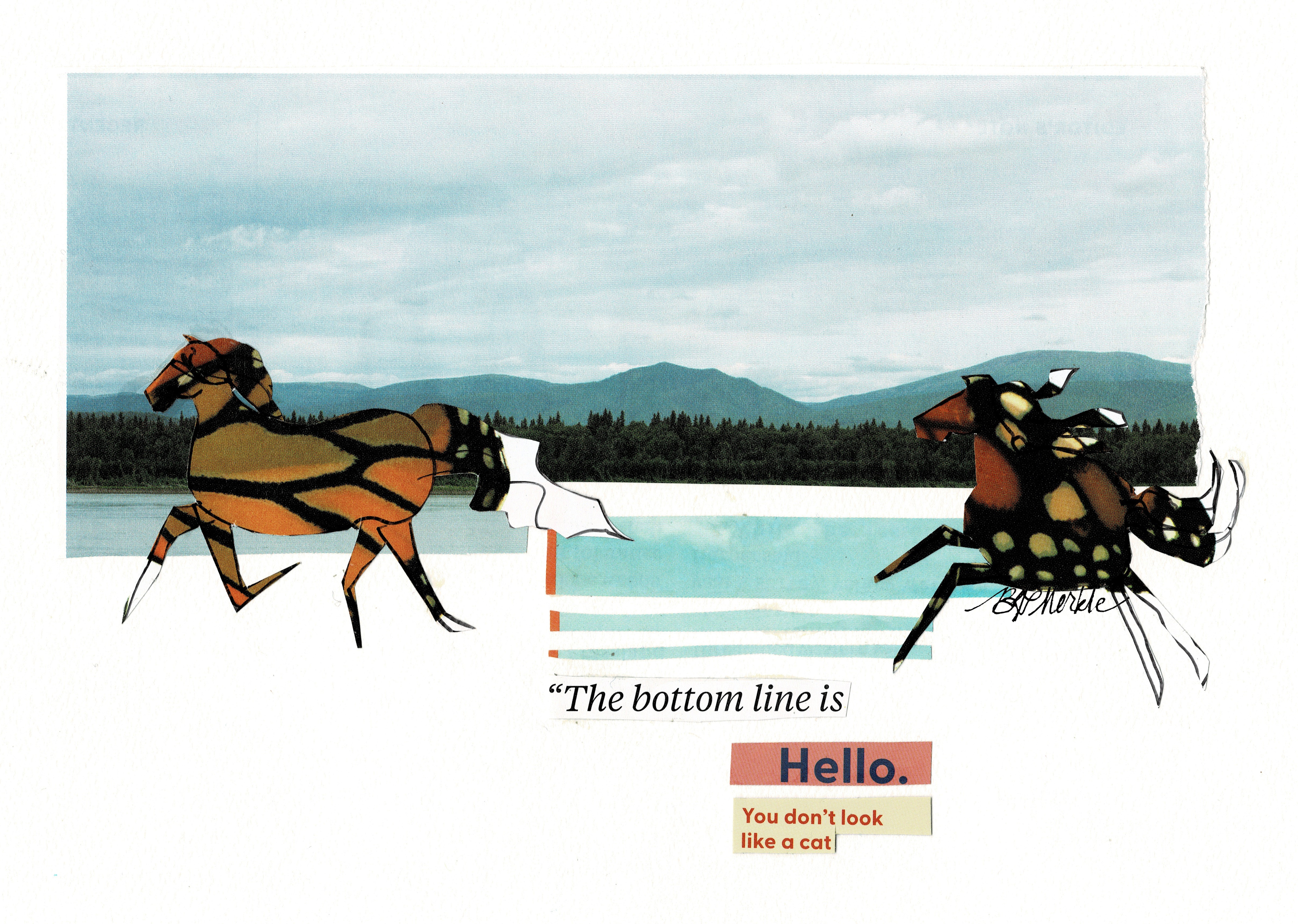 Consider the words on this collage: "The bottom line is Hello. You don't look like a cat." I'd never make those sentences on my own—much like the collaborative work I do, which couldn’t exist without the input of my research partners. Certainly I wouldn’t deliberately write them together. But, I did create them by reconfiguring words (from two different magazines and a book, plus the rest of the magazine bits I put together to illustrate the text). I'm finding mashing all this stuff together, and not having to start from scratch, really helpful and fun.